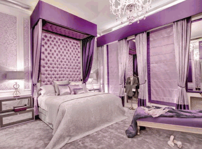 • Rich purples evoke luxury and artistry, making the bedroom lavish.